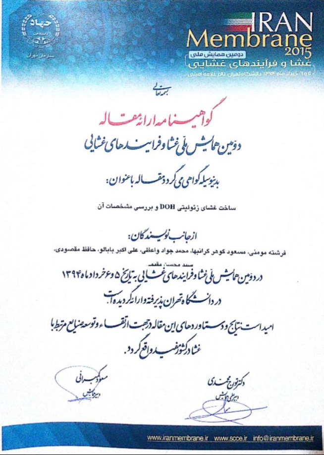 2nd National Membrane and Membrane Processes Congress and Exhibition (Iran Membrane 2015), 26-27 May, Tehran University, Tehran, Iran.