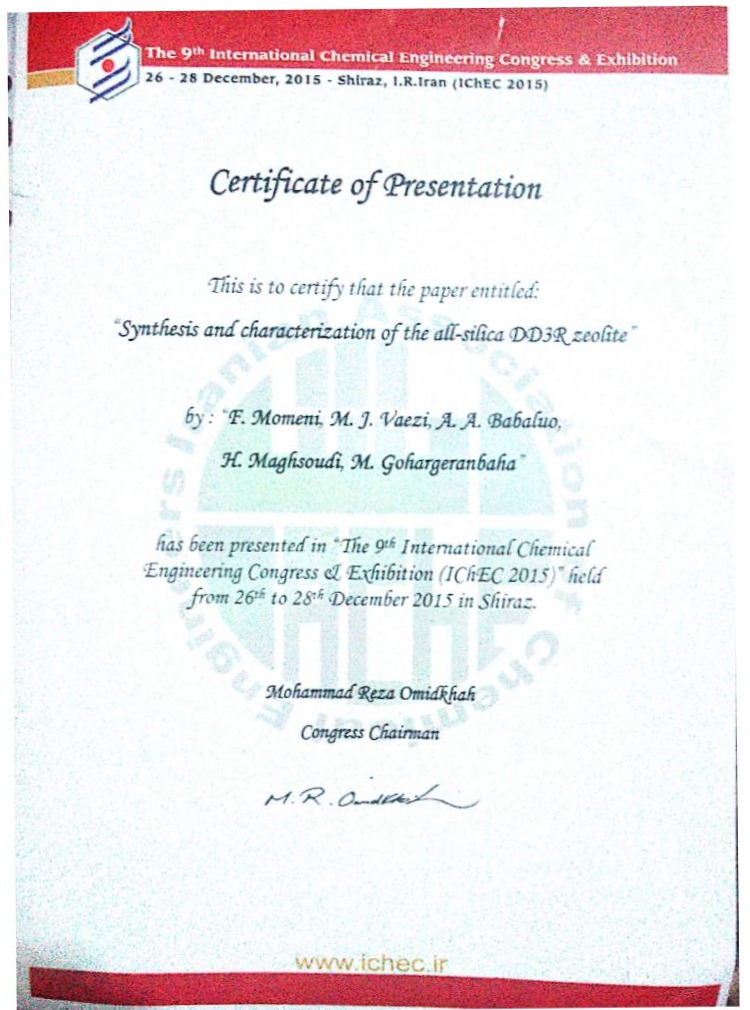 Certificate for the Synthesis of DOH zeolite membrane and its characterization paper.