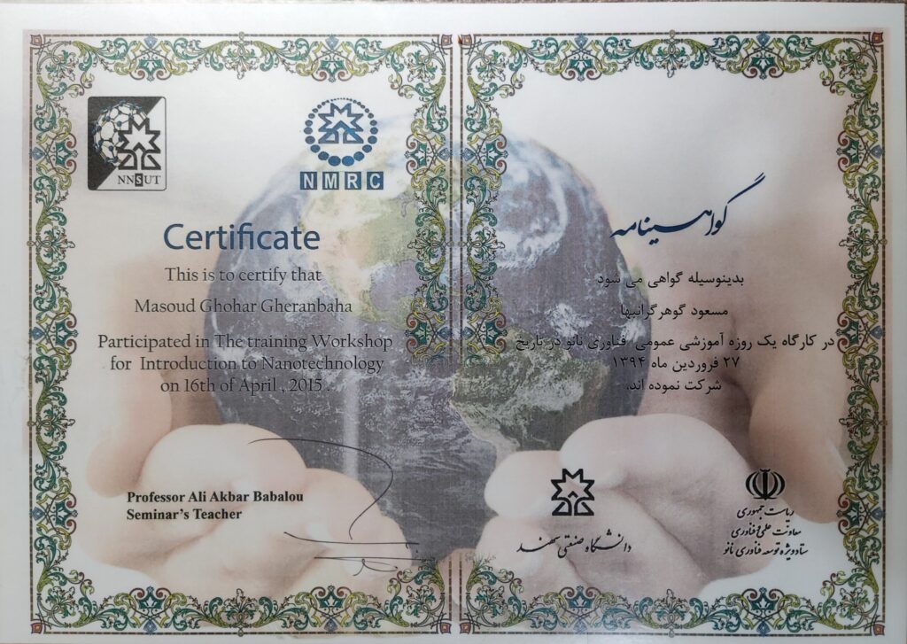 Certificate for Nanotechnology Workshop – 2015