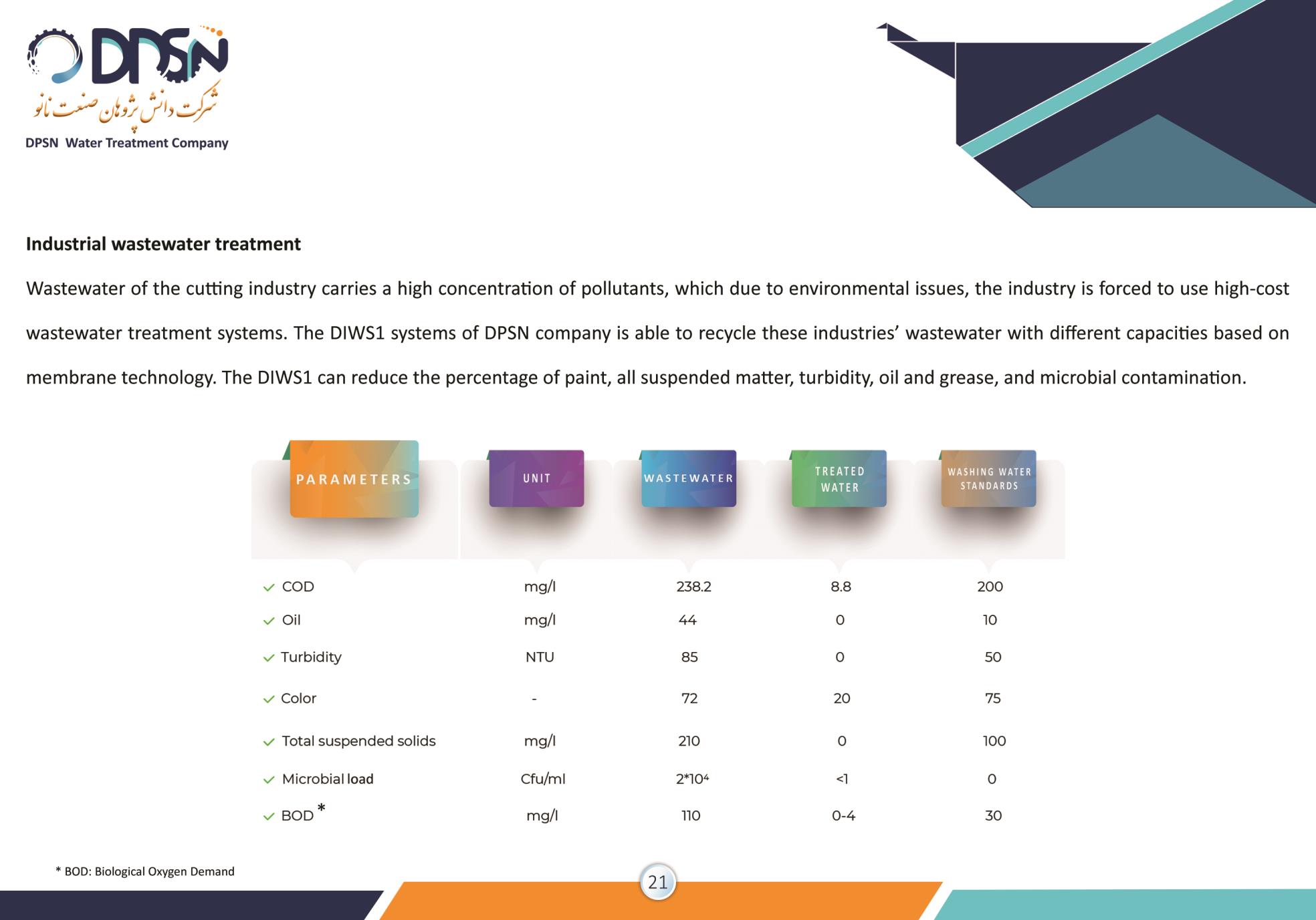 08 – Car Radiator Factory Watewater Treatment 01 - Car Radiator Factory Wastewater Treatment Plant02 - Trash Collector before Coaggulant Mixer03 - Installing Membrane Chamber Inside Wastewater Pool04 - Installed Membrane Packs05 - Installed Membrane Packs06 - Installed Membrane Packs07 - Installed Membrane Packs08 - Left side Coaggulated Facotry Wastewater - Right Side Membrane-Purified Wastewater09 - DPSN Catalog 021 - Factory Wastewater and Treated Water Analyses10 - Setting up and Delivering System11 - Setting up and Delivering System12 - Setting up and Delivering System13 - Setting up and Delivering System14 - Setting up and Delivering System15 - Setting up and Delivering System16 - Setting up and Delivering System Treated Wastewater